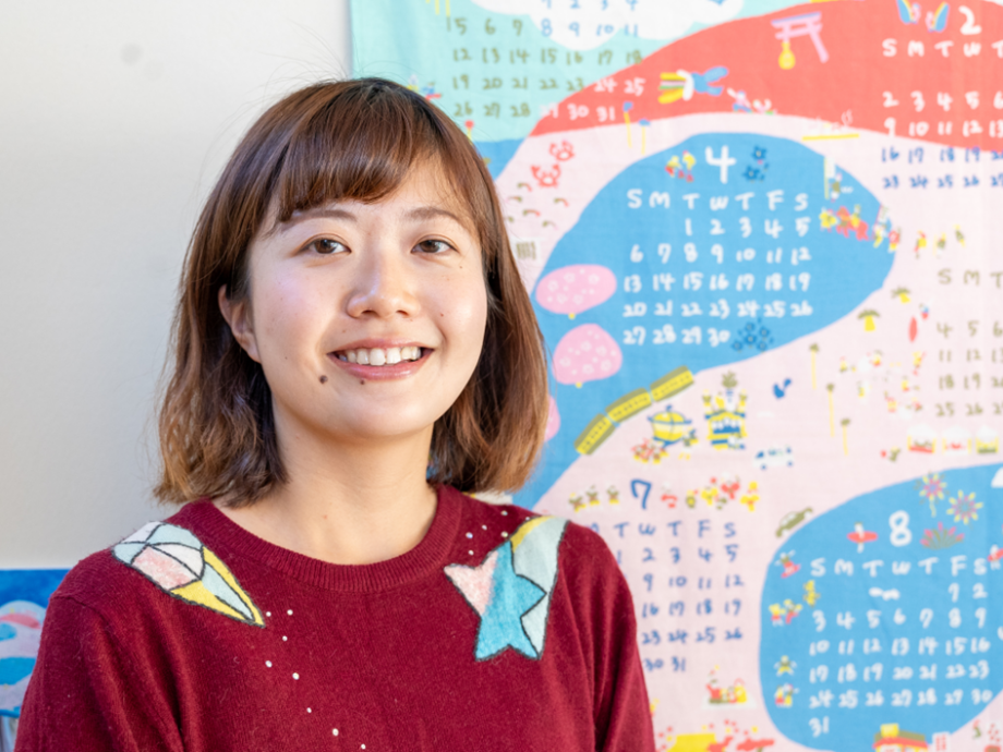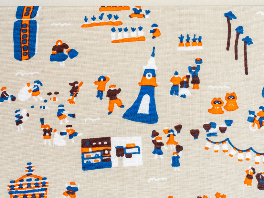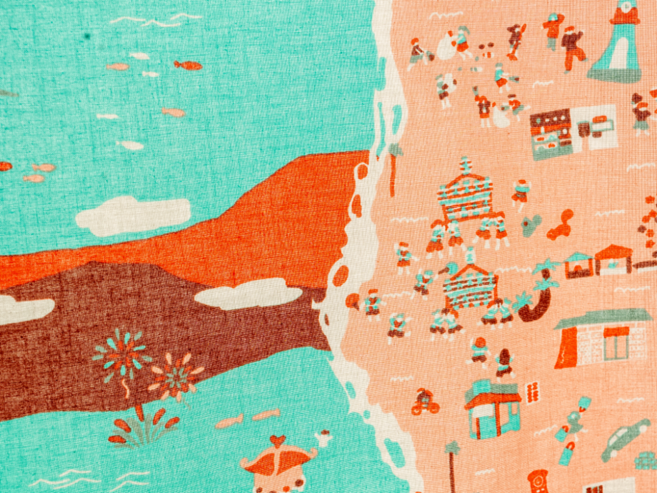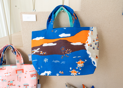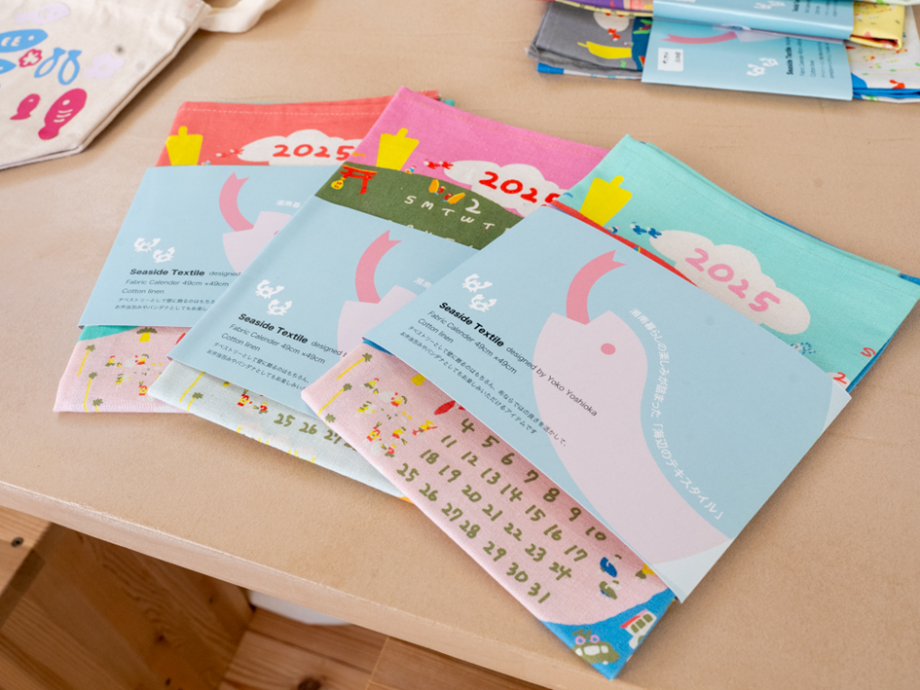 展示の中には年末にぴったりのアイテムも。海辺の日常がぎっしり詰まった「地域もよう」のファブリックカレンダー(2,310円)です。よーく見てみると、江ノ島が2025年の干支「巳」の背中の一部になっていて、その周りに地元のお祭りや、いつも立ち寄る馴染みのお店と思しきものから、浜辺でトンビに食べ物を取られてしまうといった“海辺のあるある”まで、リアルな海辺の暮らしが所狭しと愉快に描かれています。そんな小さなモチーフを一つ一つ眺めていると、「家族やお友達と絵探しとして遊んでも楽しいですよ」と吉岡さん。確かに!