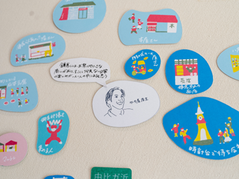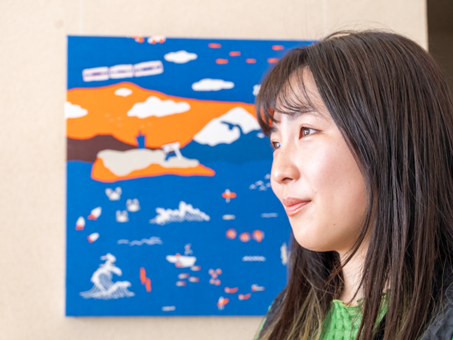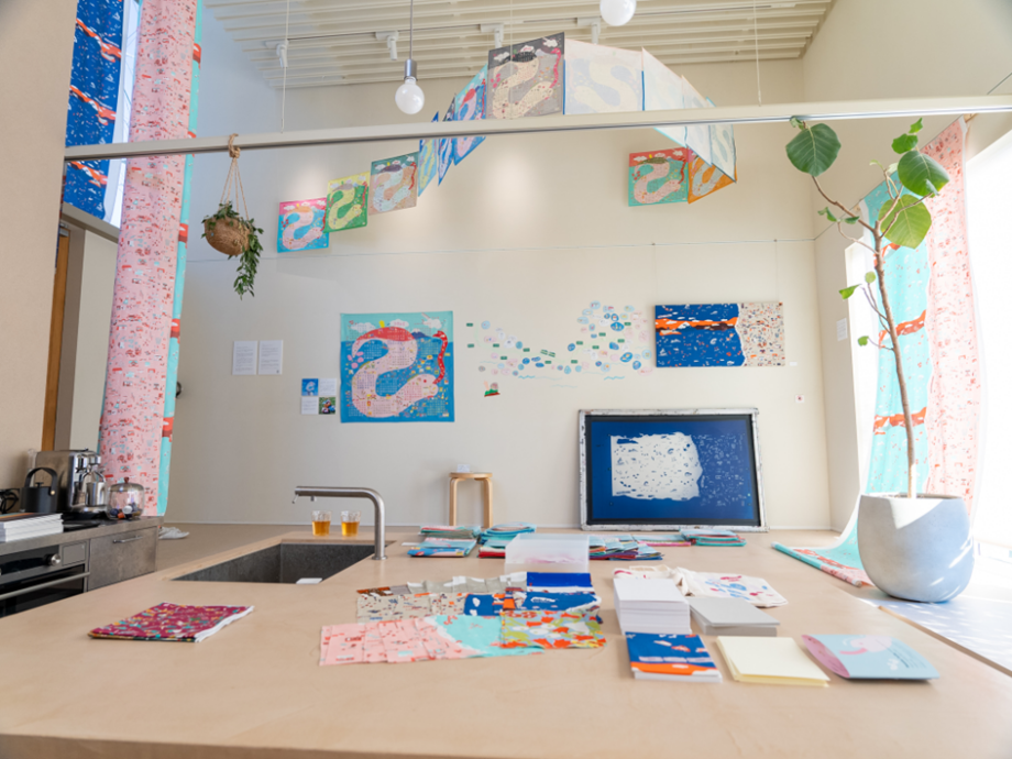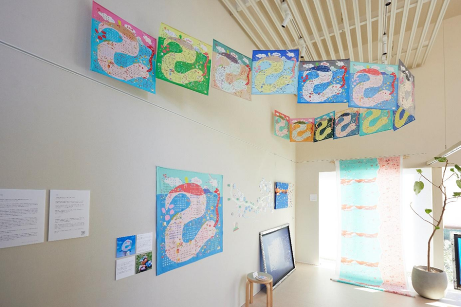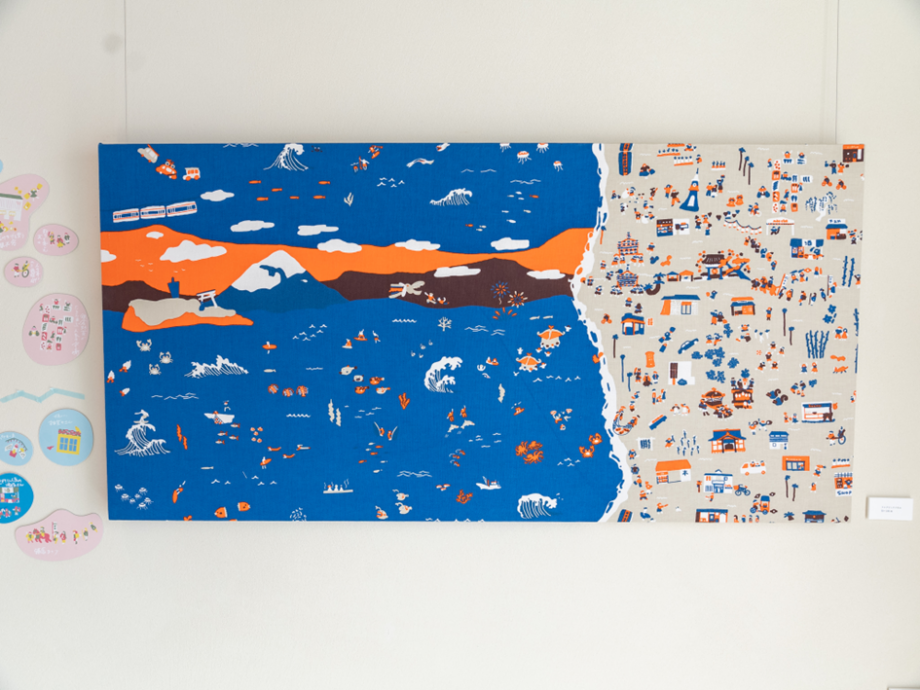 この日はテキスタルデザイナー吉岡陽子さんの企画展「海辺のテキスタイル展」が開催中。これまで様々な地域の食べ物や建物などをモチーフに作品にしてきた吉岡さん。今回は江ノ電沿線に暮らす人、営む人へのインタビューを通し、海辺に暮らす人々の日常を丁寧に拾い上げた「地域もよう」を描きました。