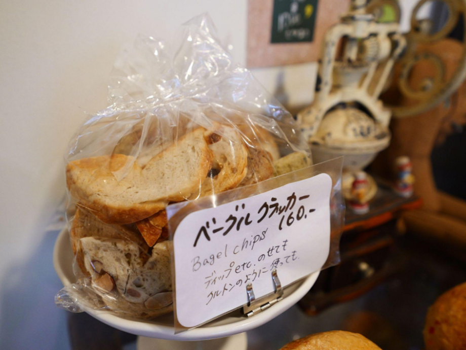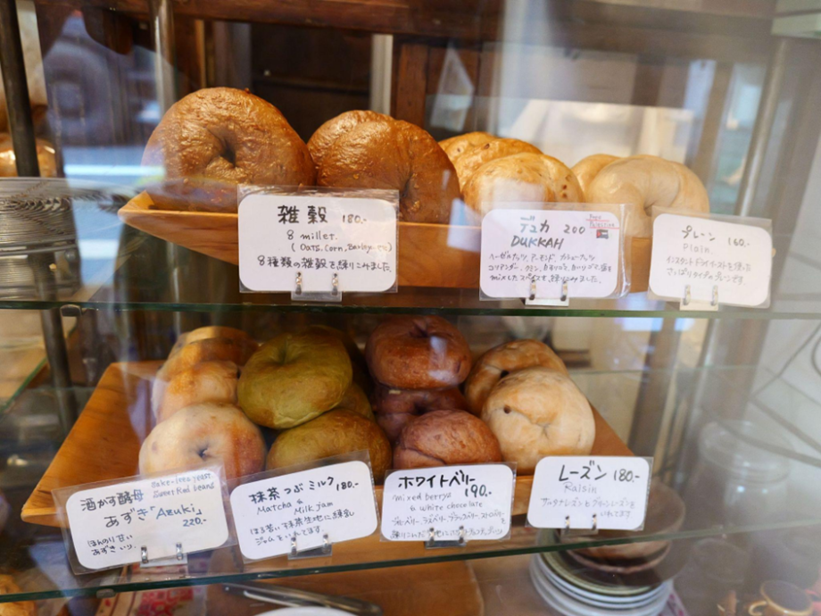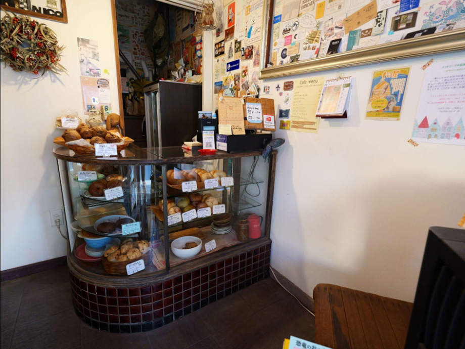 「Bagel cafe nico.」の扉を開けると、ベーグルが並ぶレトロなショウケースが、真っ先に目に入ります。個性豊かなベーグルとあわせて店頭に並ぶのは、日替わりで登場するマフィンとビスケットです。