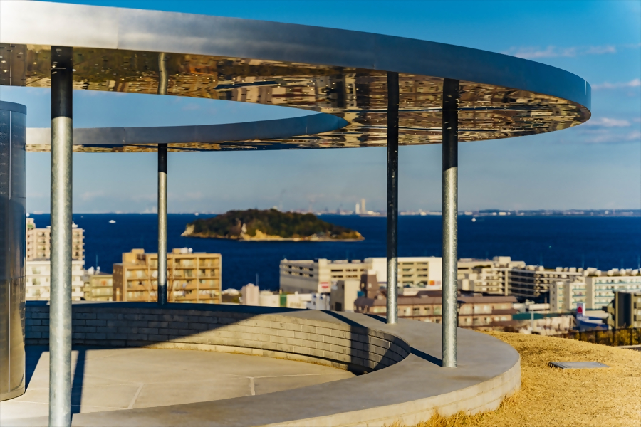 横須賀のまち並みと東京湾を一望できる、開放感あふれる眺望が魅力の公園です。園内には円形のモニュメントが設置され、毎月1日や2月15日などの定められた日には、上空へ「平和の光」が照射されます。