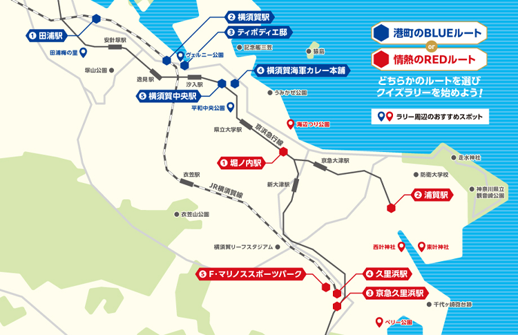 ①堀ノ内駅/②浦賀駅/③京急久里浜駅/④久里浜駅/⑤F・マリノススポーツパーク