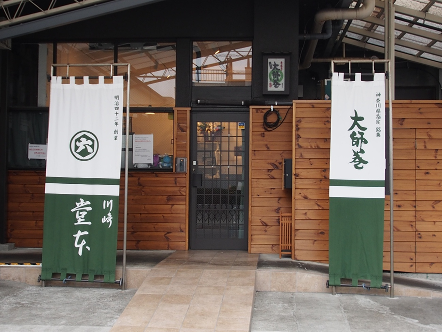 駅を出て、東に1㎞ほど歩いたところにあるのが、「堂本 元木本店」です。堂本の商品でひときわ人気なのが「大師巻(だいしまき)」。50年以上作り続けている伝統あるせんべいですが、「神奈川県指定銘菓」に選ばれたのは2014年、「かながわの名産100選」に選ばれたのは2019年と、名実ともに「堂本」の看板商品になった煎餅なのです。
