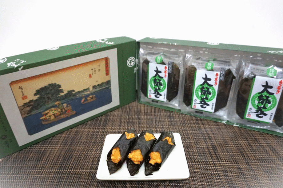 揚げ煎餅がお大師様、海苔が袈裟(けさ)のようだったことから「大師巻」と名付けたのだそう。縁起がよく、贈り物にも喜ばれる一品です。