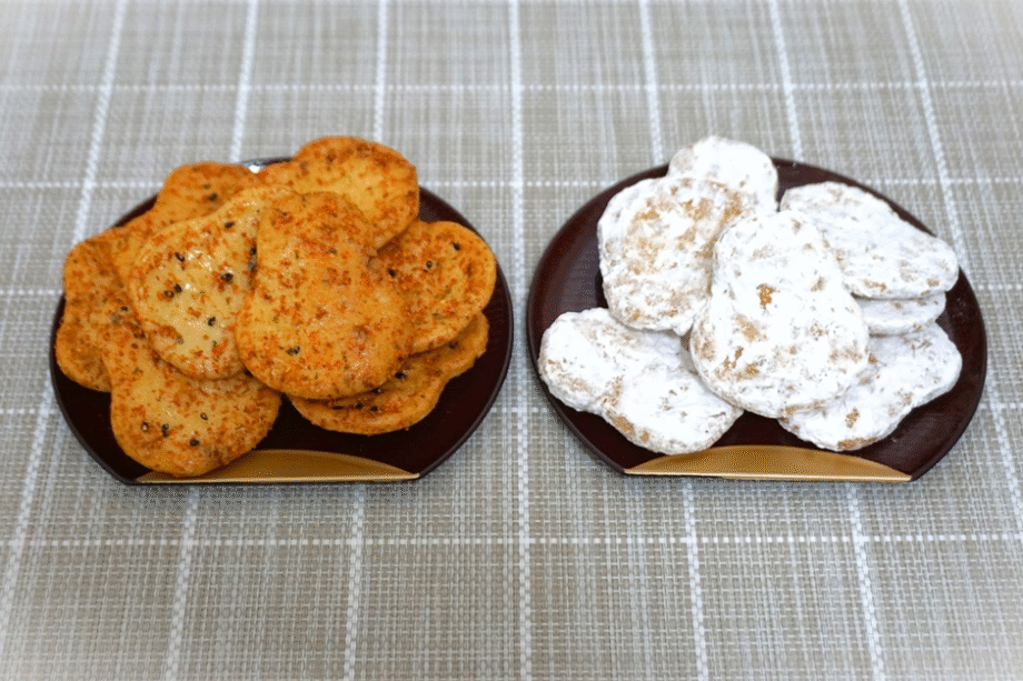 「砂糖」はだるまの形が雪だるまみたいにも見えて、皿に出したときにカワイイ感じ。口の中でスッと砂糖が溶けて煎餅とよく混ざります。