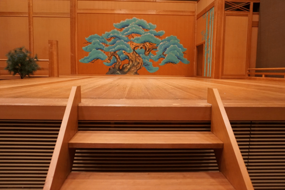 舞台正面には、大きな松の木。能が始まった室町時代から、人が集まるところに松が生えていたり、長生きの象徴とされていたり。常緑なので、演目の季節を問わず存在できることも描かれている理由なのだとか。