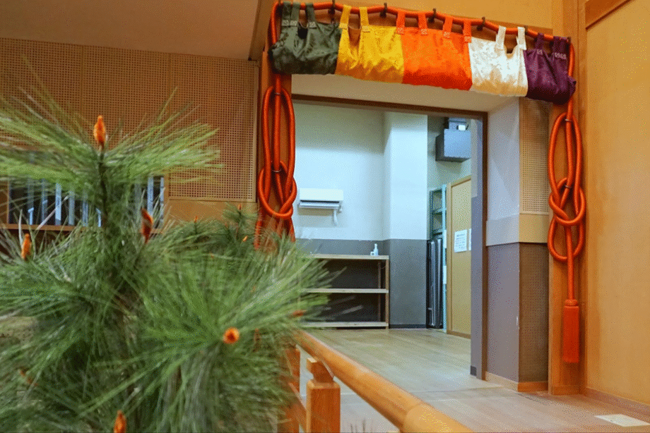 能楽堂は舞台でありながら、「どん帳(幕)」がありません。代わりにあるのが演者が出入りするところにある5色の「揚げ幕」です。