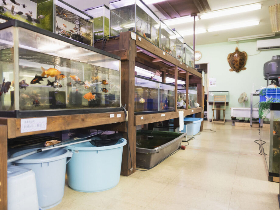 店内は徹底した水質&衛生管理により、アクアショップ特有のニオイはなく、明るくクリーンな印象。水槽の前を人が横切ると、元気よく後を追ってくる金魚たちはとても愛らしく感じられます。