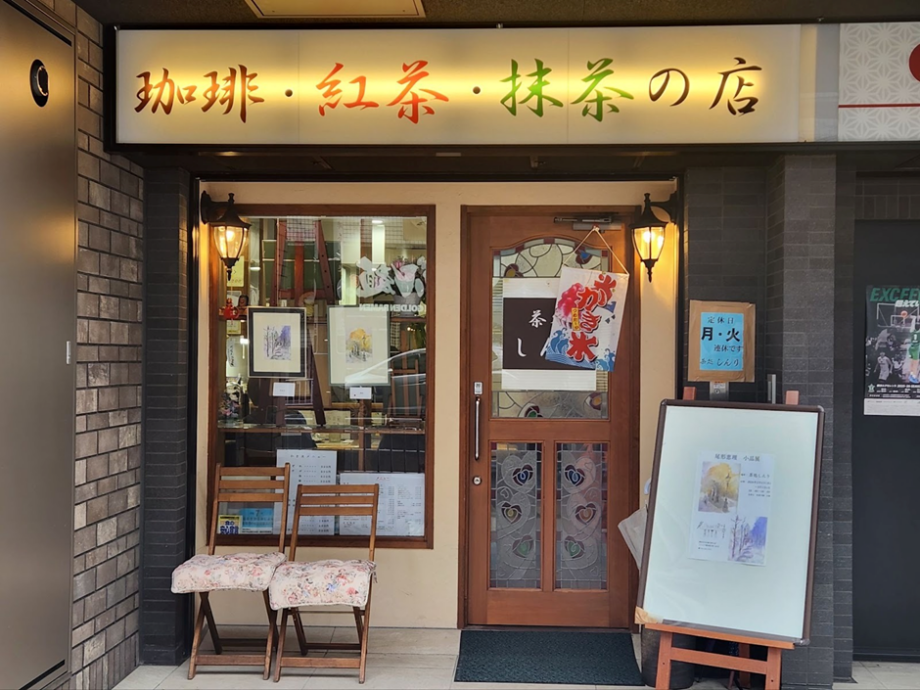 おなかいっぱいになって、「ちょっとお茶するところはないかな」と散歩をしていて見つけたのは、「珈琲・紅茶・抹茶の店」という気になる看板。ドアを開けるとベルがカランとなり、「小さなところですが……」と控えめな店主が迎えてくれました。
