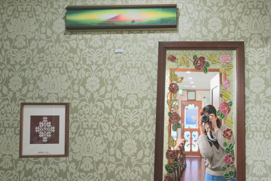 壁一面には、額縁に入った絵がずらり。「茶処しんり」では、アマチュアのアーティストに限り、毎月1組ずつ無料で店内壁面を貸し出しているのだとか。残念ながら、この小さな美術館は2027年末で終わりになる予定ですが、最後の月まで予約がいっぱいです。