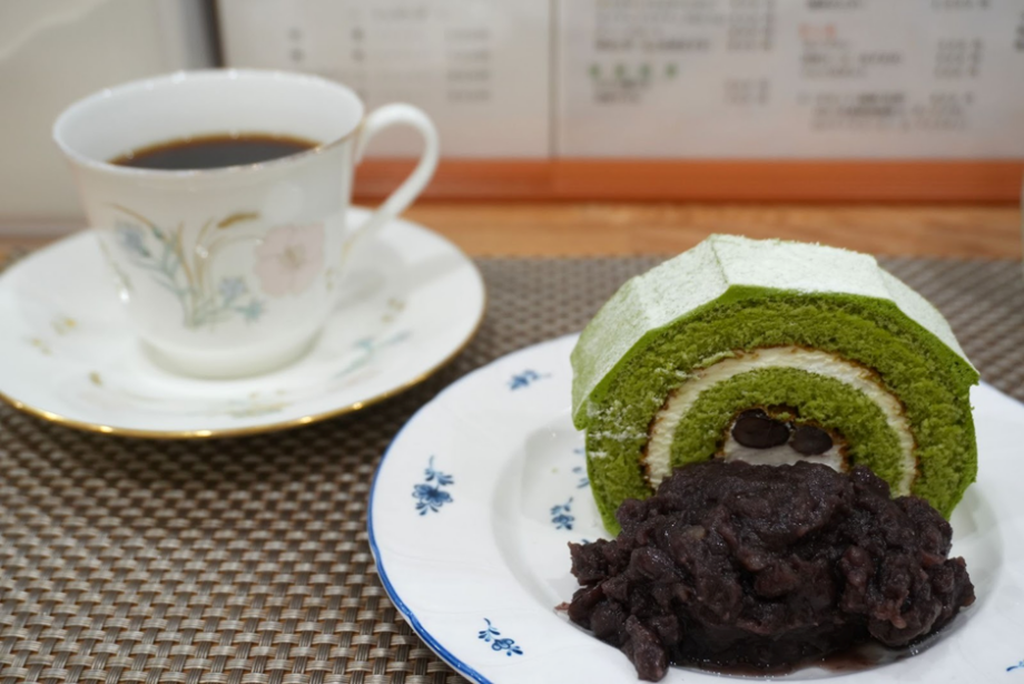 手作りの粒あんを山盛りに添えた抹茶ロールケーキ。粒あんは、ほんのり塩味。さっぱりとした甘さで、抹茶のケーキとよく合います。
