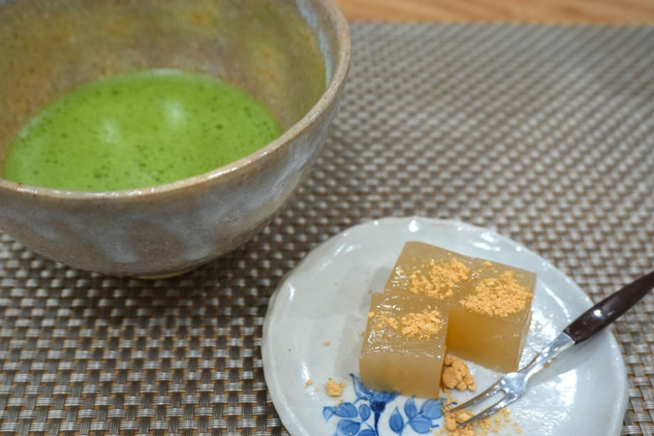 抹茶を立てると店内いっぱいに広がるお茶の香り。思わず深呼吸をしたくなりました。 抹茶に添えられているのは、わらび羹(かん)。わらび餅ではなく、わらび粉を固めて羊羹(ようかん)のようにしたもの。とは言え、羊羹より柔らかく、わらび餅より硬く、ゼリーくらいの食感です。