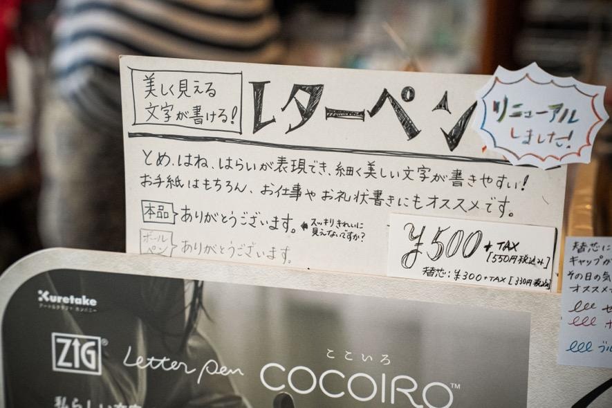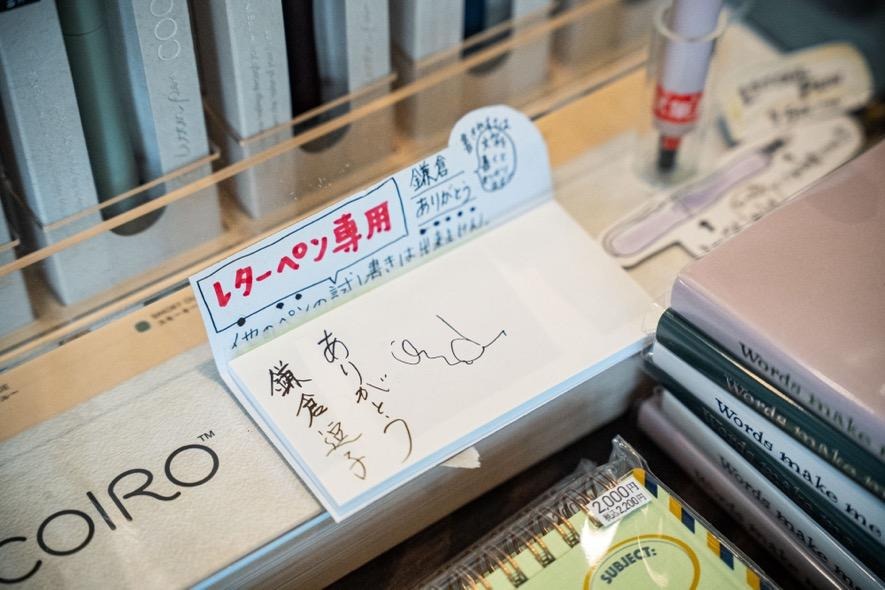 最近の売れ筋をスタッフの柴田久美さんに伺うと、「レターペンが人気です」とのこと。とめ・はね・はらいが表現できる美しく見える文字が書けるペンで、お手紙やお礼状におすすめだとか。実際に試し書きしてみると、たしかに文字が綺麗に見える気がする!