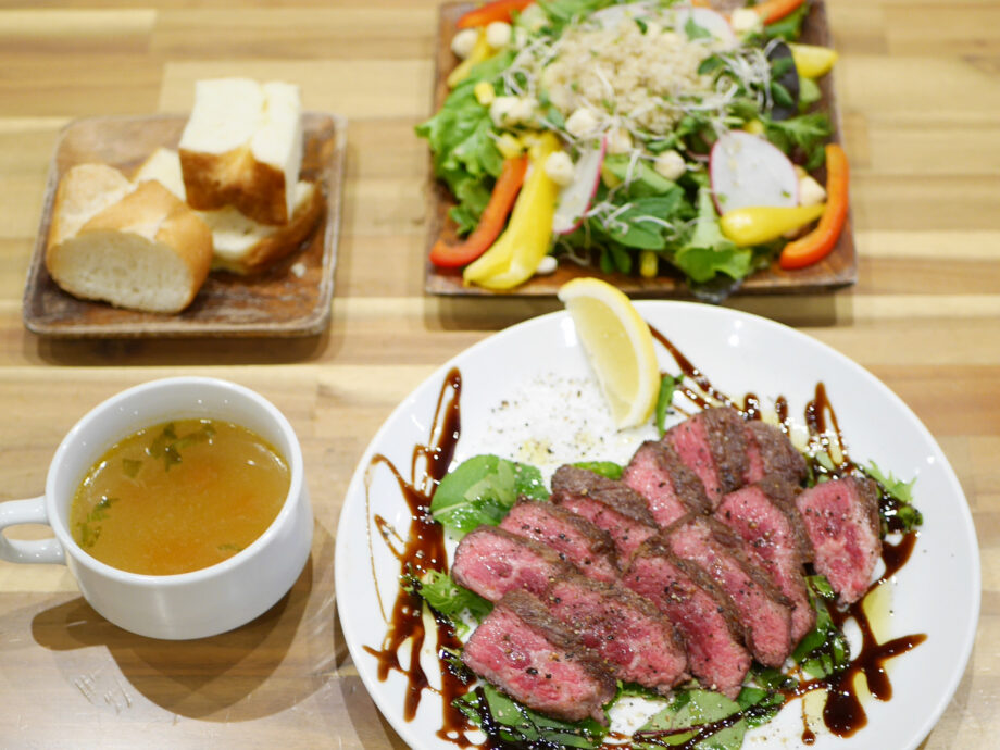 ジューシーなタリアータと、自分好みに盛れるフレッシュなサラダの組み合わせは、軽やかさと満足感のバランスが絶妙です。