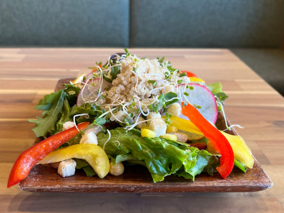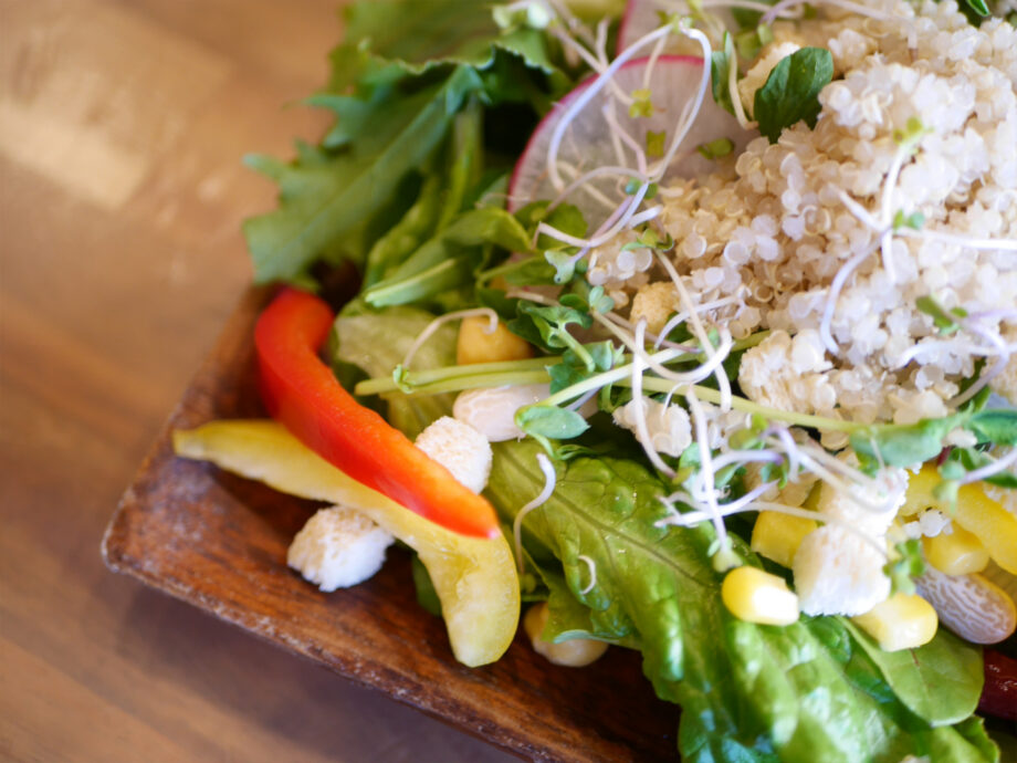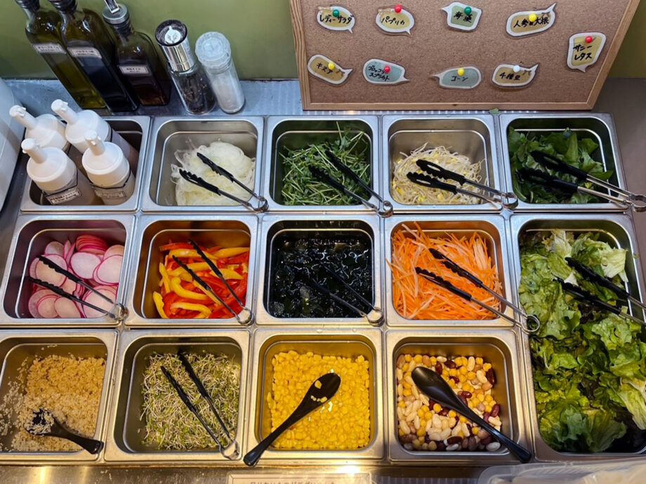 現在もサラダバーへのこだわりは変わらず、サニーレタス、キヌア、豆類、海藻、パプリカなど彩り豊富な新鮮野菜が並びます。自家製ドレッシングは4種、女性を中心に高い人気です。