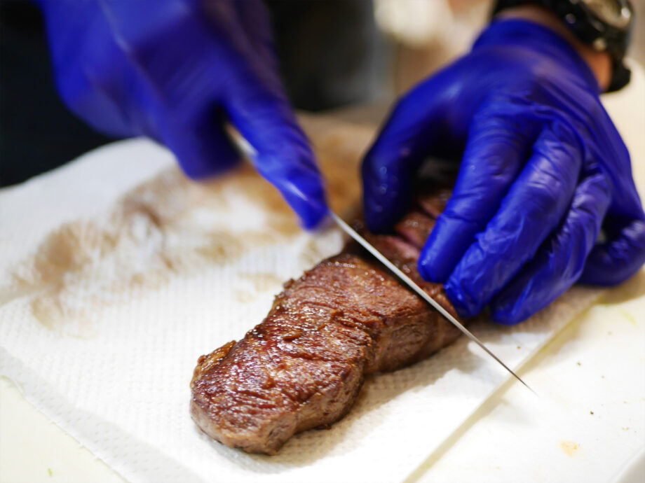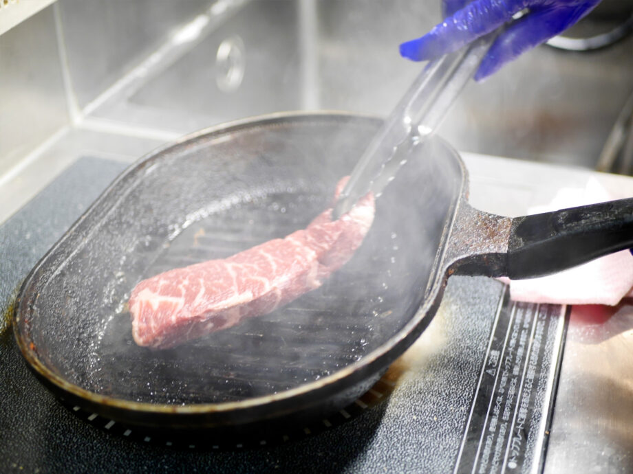 こだわりは、軽く食べられるよう程よく脂のある牛肩ロースを厳選。肉汁の流出を防ぎ、ジューシーに仕上げるため、焼く直前に塩をしっかり当てて旨味を閉じ込め、一気に焼き上げます。