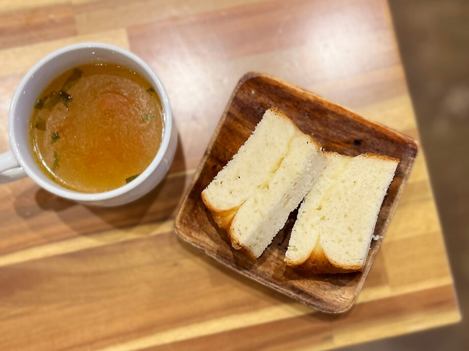 ランチセットには12種の新鮮野菜のサラダバー、スープ、パン、ドリンクが付きます。