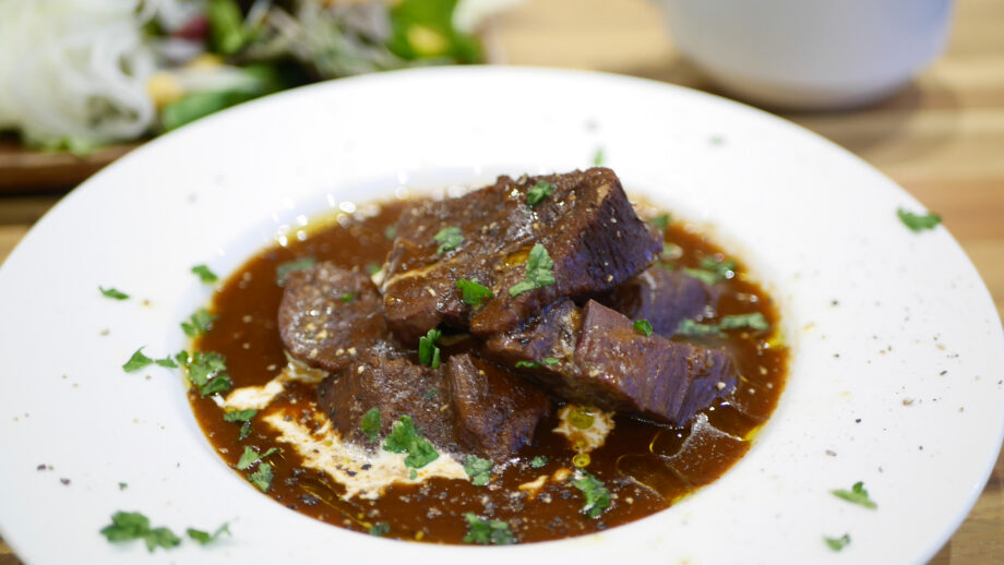 お皿に並んだミディアムレアの牛肉から、ふわりと立ちのぼる香ばしさ。スライスされた断面はしっとりと艶やかで、ひと口頬張れば、外側の香ばしい焼き目と中のジューシーな肉汁が一気に広がります。