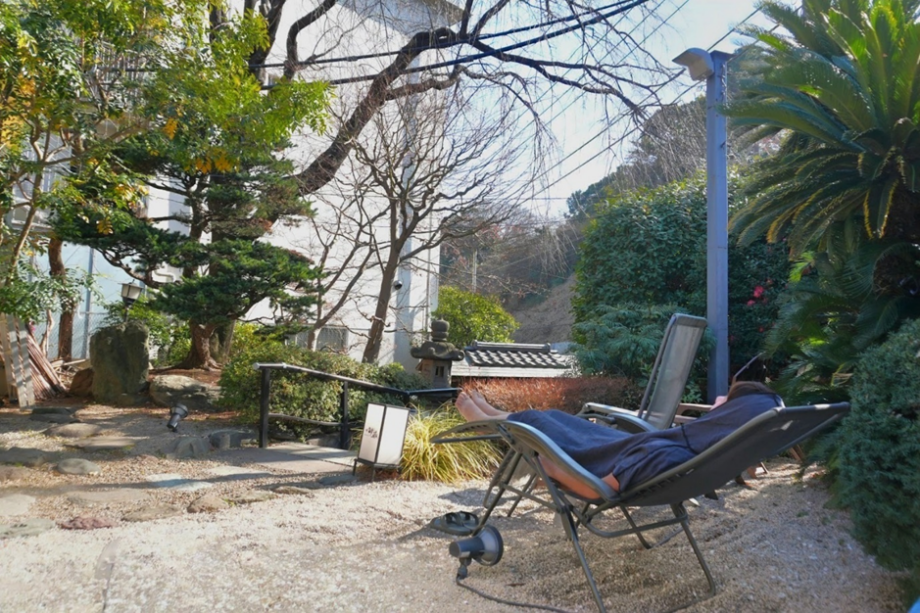 外気浴スペースは2か所あります。サウナ室からつながった外気浴スペースは、裸で利用することができますが、おすすめは日本庭園での外気浴(ポンチョ着用必須)。