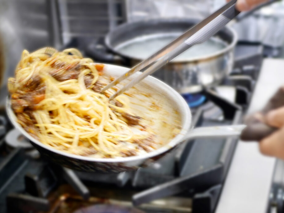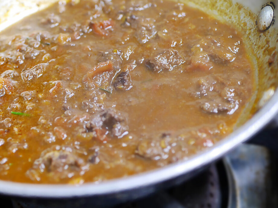 旨みを引き出す秘密は、ひき肉を塊状で焼き付けるフレンチの技法「ステックアッシェ」。ここに赤ワインを加え、香りを閉じ込めながらじっくり煮込みます。仕上げはバターでコクとツヤを加える「バターモンテ」とパルミジャーノ・レッジャーノで風味をさらに高めます。