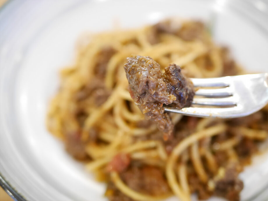 煮込み料理の奥行きのある味わいと、コラーゲン豊富な弾力ある食感のソースが太めの乾麺にソースがよく絡み、ひと口で深いコクと肉の甘みが広がり、思わず笑みがこぼれます。