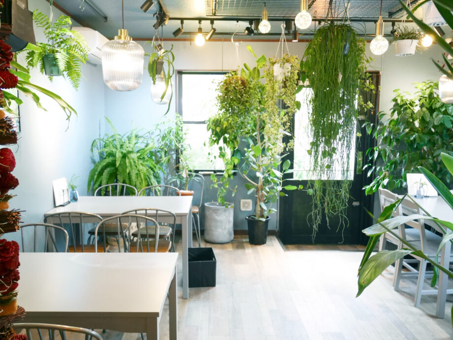 店内には植物に囲まれ、スイーツやコーヒーを味わえるカフェが併設され、訪れる人の心を豊かにしています。