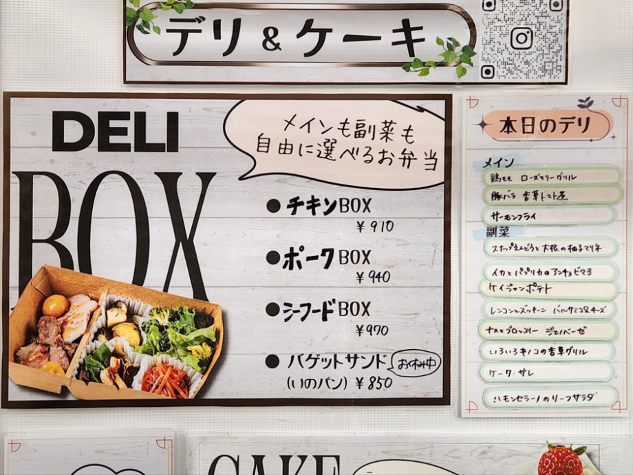 毎日のデリは、メイン3品に副菜8品。その日のメニューは店舗前の看板やインスタグラムで確認できます。家でインスタグラムを見て「今日はどれにする~?」なんて家族で相談してから買いに行くのも楽しいかも。