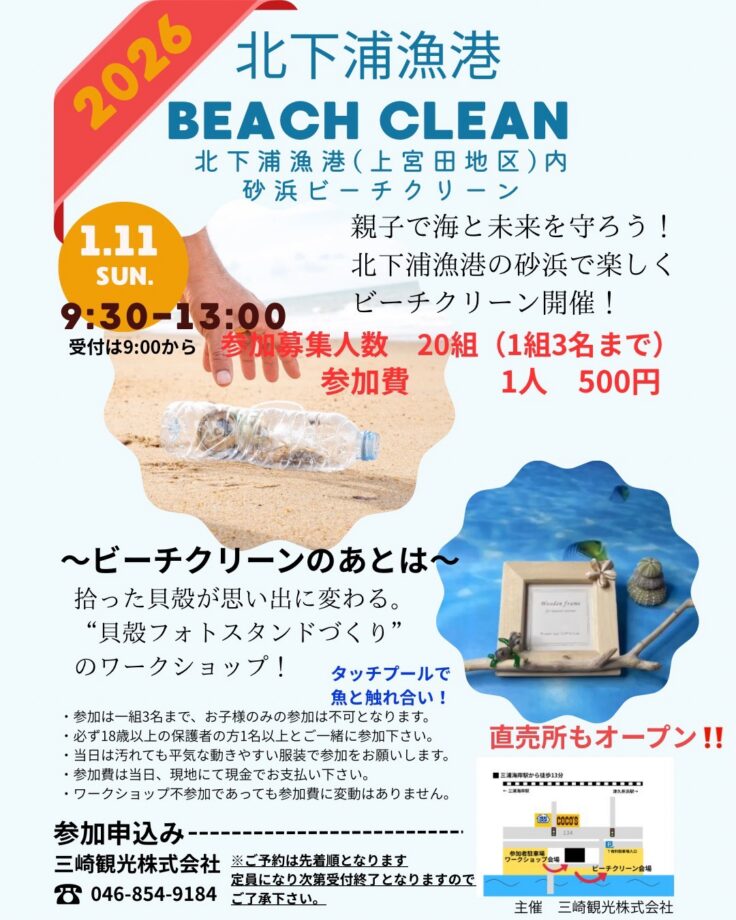 海をきれいにしながら、自然の恵みを楽しむ特別イベントが開催されます。 三浦市・北下浦漁港(上宮田地区)の砂浜で、ビーチクリーンと貝殻を使ったアート体験を一緒に楽しみませんか?