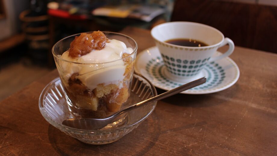 コーヒーは横須賀のスペシャルティコーヒー専門店「TSUKIKOYA」の豆を使用。注文を受けてから豆を挽き、ハンドドリップで丁寧に入れてくれるため、店内にはコーヒーのいい香りが漂います。今回いただいたエチオピアは、深煎りなのに重たさがなくすっきりとした味わい。りんごのトライフルとの相性も抜群でした。