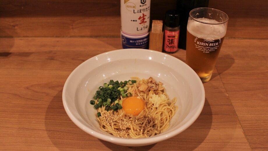 しいたけ支那そばをあっという間に完食してしまったので、追加で生卵の和え玉と生ビールを注文しました。和え玉は全体をよく混ぜてから、まずはそのまま、次にスープにつけて食べるのがおすすめだそうです。