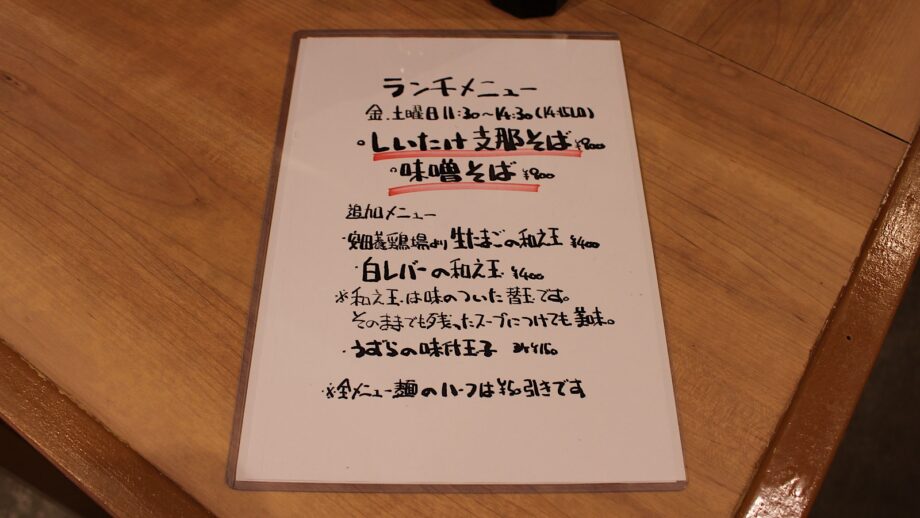 ランチメニューは、しいたけ支那そばや味噌そばに加え、追加で楽しめる和え玉(味のついた替玉)などがそろいます。