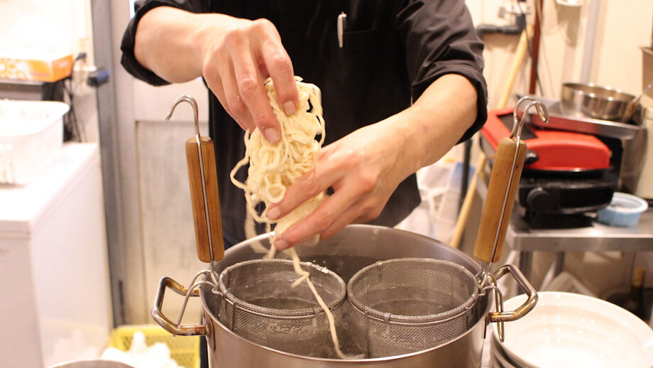 ラーメンにのっているのは、一般的なチャーシューではなく鶏肉のコンフィ。塩とこしょうをベースに、ラーメンの味を邪魔しない程度のハーブで下味をつけ、低温の油でじっくりと火を入れていきます。その油はラーメンにも使っているのだそう。