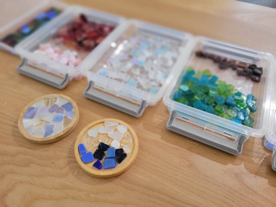 モザイクガラスのコースターも、好きな色や形を選びながら枠内を埋めていくことで、キラッと光るオリジナル作品ができ上がります。
