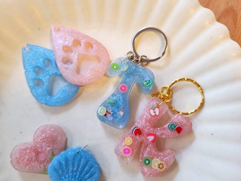 余った溶剤はかわいいチャームに変身!アルファベットやハート・星の型に流し込んでいきます。ラメやフルーツのビーズをお好みで入れるのもおすすめ。