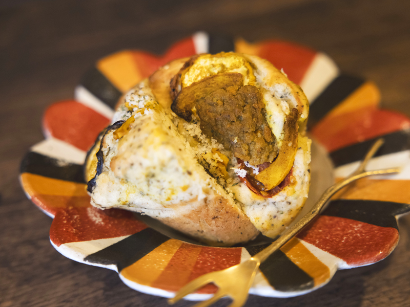 温められたマフィンから漂うスパイシーな香りによだれが落ちそう。辛党の菊地さんがこだわったキーマカレーは細かな合いびき肉にたまねぎ、にんじん、すりつぶしたじゃがいもが混ざり合い、とてもなめらかな仕上がりです。さらに夏野菜の彩りをトップに飾って、惣菜パンならぬ惣菜マフィンの出来上がり。