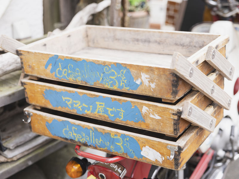 店先に停めてあるレトロな赤い郵政カブ(HONDA MD90)は菊地さんの愛車です。お声があれば荷台にボリューミーなマフィンを載せて、三浦半島で開催される各イベントに出張販売に出かけるのだそうです。そんな菊地さんですが、バイクに乗り出したのはお店を始めてからのよう。