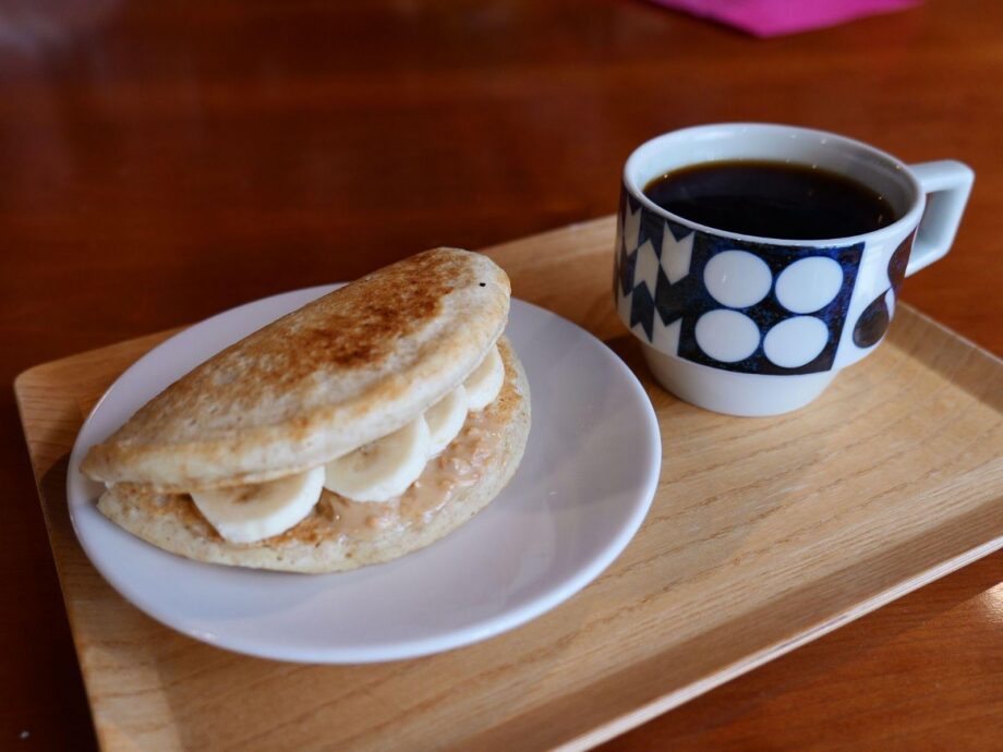 この日のメニューは、バナナとピーナッツペーストのパンケーキサンド(650円)、コーヒー(500円)と紅茶(450円)でした。