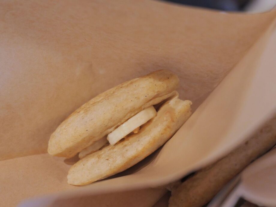 砂糖を使っていないパンケーキなのに生地はほんのり甘く、それでいてバナナやピーナッツペーストの甘みで存在感が薄くなりません。ふわふわの食感と相まって贅沢な味わいです。