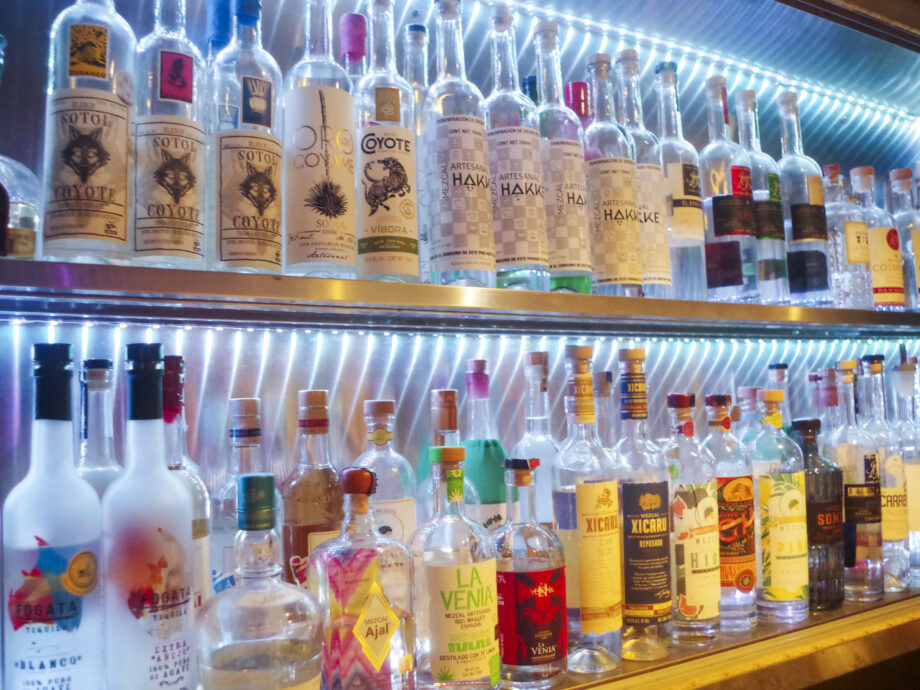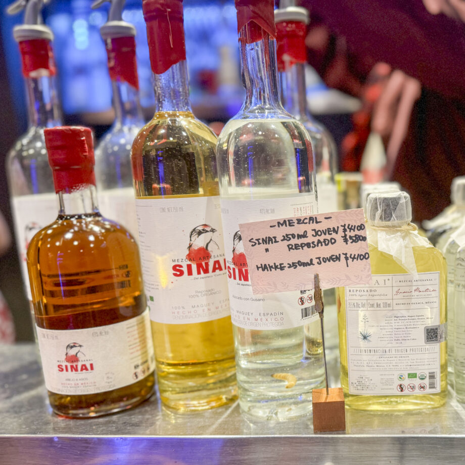 店内に入ると色とりどりのボトルがずらりと並んでおり、これらはアガベを原材料とするメキシコ原産の蒸留酒・メスカルです。