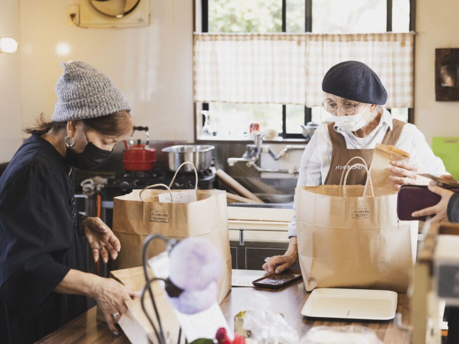 「パンのきたがわ」には顔なじみのお客さまが次々と訪れては、おしゃべりを楽しみながら店主・北川絹江さんお手製のパンを購入していきます。