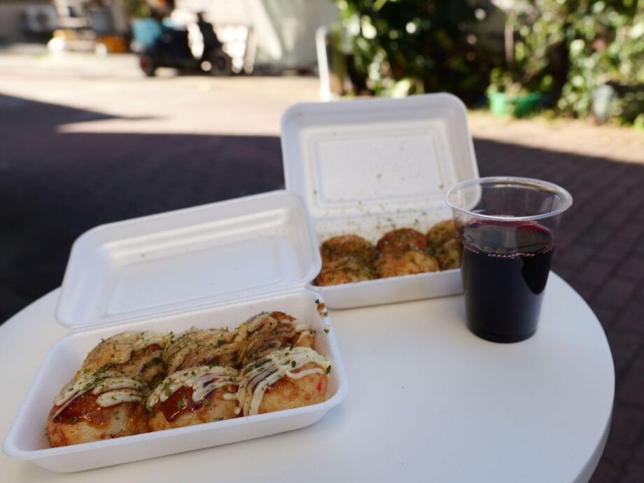 たこ焼きは持ち帰るのが基本ですが、小さなテーブルもあり、少人数であればそこで食べることもできます。この日はたこ焼きと一緒に赤ワイン(400円)を頂きました。