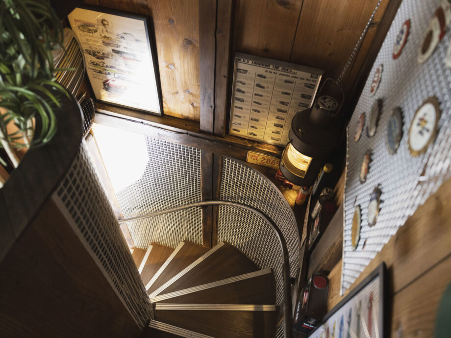 外観は“和”の趣を残しながら、内部はクラシックカーの世界観と見事に融合されています。特に印象的なのは、2階建てロンドンバスの螺旋階段の曲線を再現して造られているという階段。