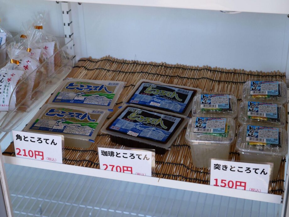 こんにゃくと並ぶ主力商品ところてんの特徴は、豆腐のような四角いパックでカットせずに販売されていること。その理由は、この地域ではどのご家庭にも「ところてん突き(ところてんを押し出す道具)」があるからなのだそう。
