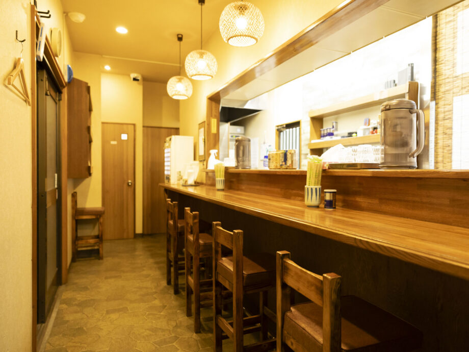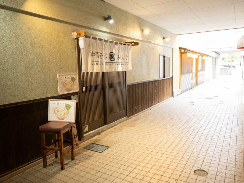 三浦海岸駅から高架線に沿って歩いていくと「中華そば」と書かれたのぼりを発見。雰囲気のある飲食店街の1階に、白い暖簾がかかった「中華そば あら井」があります。