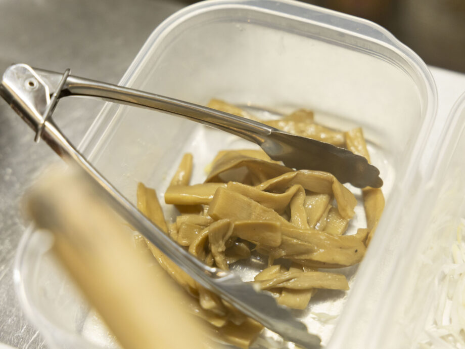 具材もすべて店内で仕込みます。メンマは一晩塩抜きしてから、翌日に胡麻油と自家製醤油だれなどで完成。時間をかけた低温真空調理のしっとり鶏胸肉と、バーナーで焙って仕上げた豚バラチャーシューを一枚ずつ、白髪ネギ、三つ葉、そして海苔が添えられます。