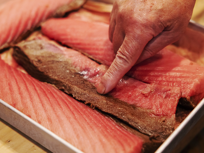 茜身を正式に取り扱うために、神奈川県水産試験場の方々の講習会に何度も参加したという伊豆島さん。これまで一般的には廃棄部分として認識されていた茜身(血合肉)ですが、伊豆島さんなりに思うところがあったようです。