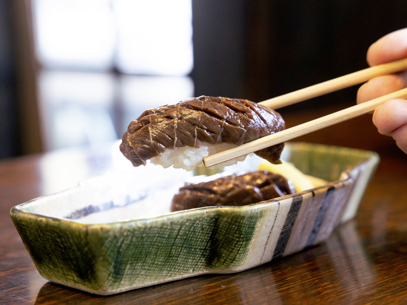 暗い色をした「茜身の握り」(一貫220円・税込)を見たときに、少しぎょっとする人もいるかもしれません。こちらは、魚類特有の筋肉である「茜身」を新鮮なまま漬けにした握りです。