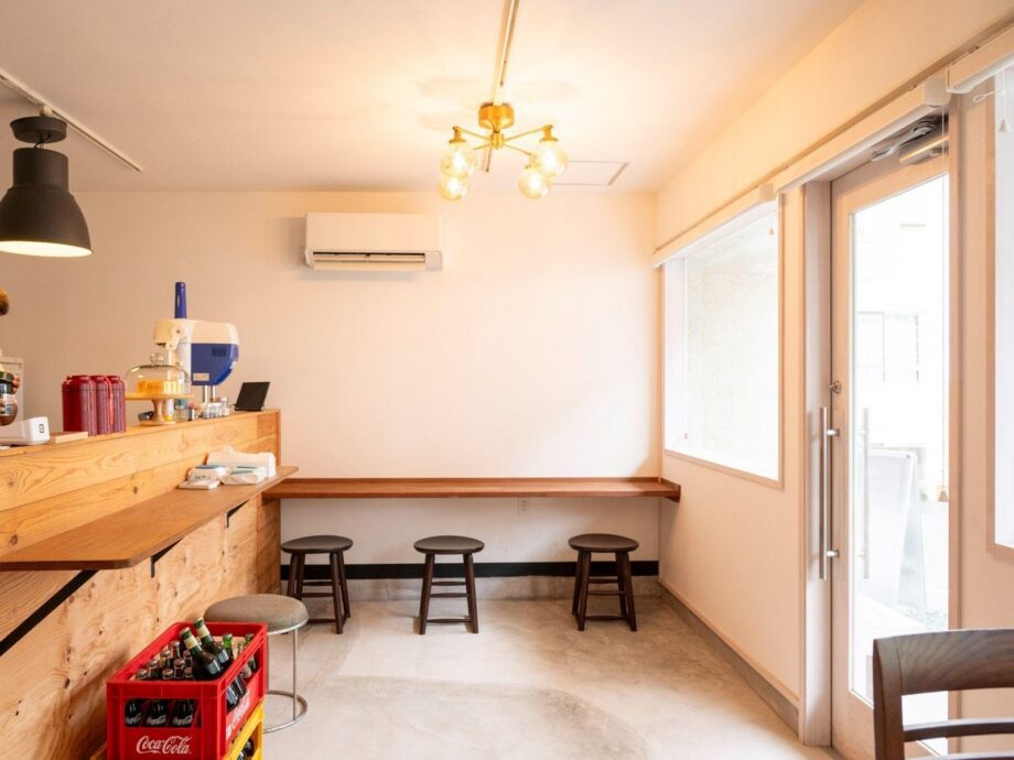 大きな窓から光が射し込む明るい店内には、カウンターやテーブルの椅子席があります。お客さまの増加により、それまで居間だったスペースも客席用に拡張しました。カウンター席はワンちゃんと一緒に入れる席です。