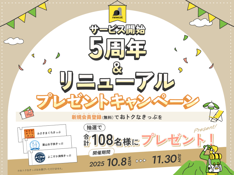 キャンペーン期間中にnewcalの新規会員登録(無料)をされた方を対象に、「おトクなきっぷ」を抽選で合計108名さまにプレゼント!