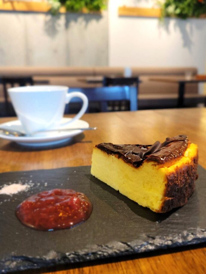 ドリンク+ドルチェセットを注文し、「デカフェコーヒー」と「バスクチーズケーキ」をいただきました。後味がやさしいデカフェと、濃厚なチーズケーキがよく合います。