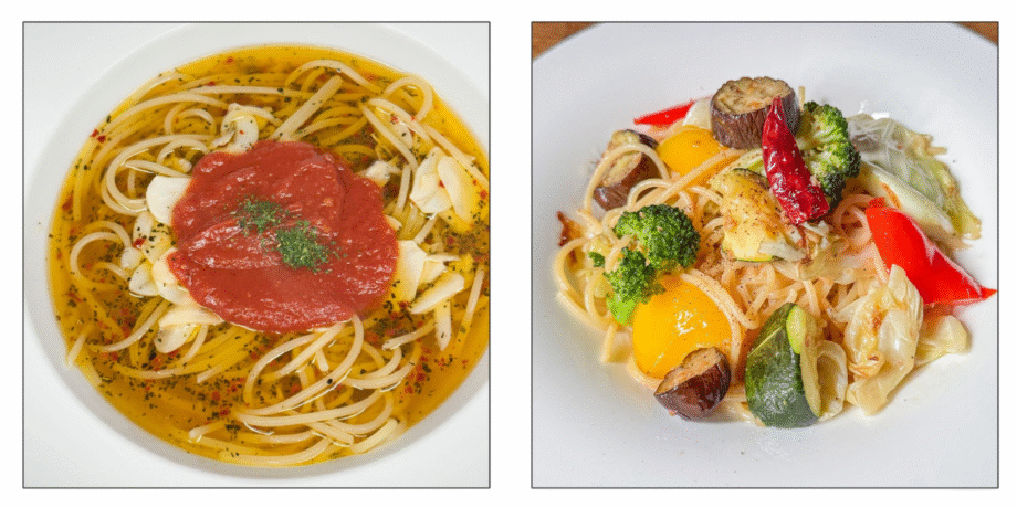 オープン当初から定番人気の「トマトスープパスタ」は、野菜と鶏ガラをじっくり煮込んだスープで体がぽかぽかに。また、「彩り野菜のペペロンチーノ」もカラフルなツヤが食欲をそそりますね。